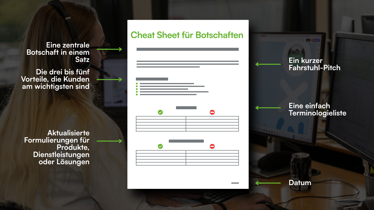 Ein Cheat Sheet für Botschaften ist ein simples Tool, das Ihr Team tagtäglich nutzen kann, um Konsistenz zu wahren. Es ist kurz und auf den Punkt, um sicherzustellen, dass es für Ihr Team tatsächlich von Nutzen ist.