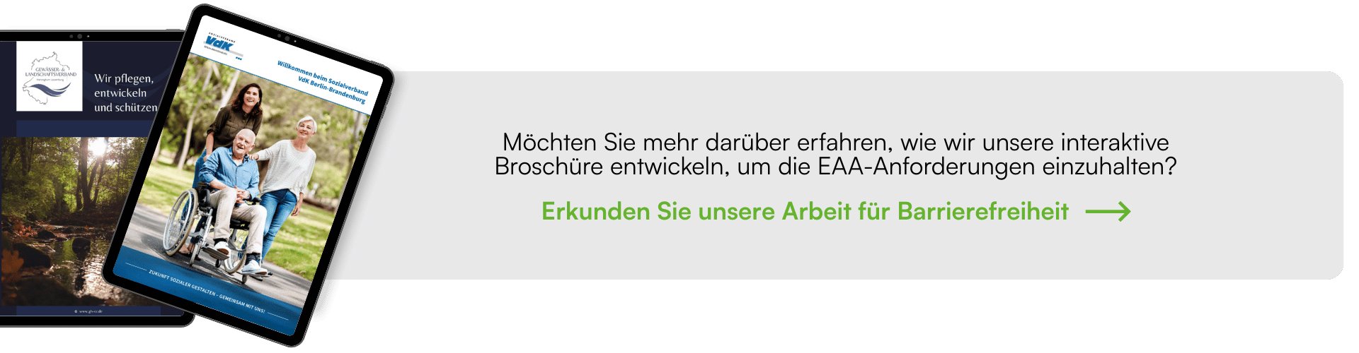 Das gilt für Ihre neue Website, Broschüre, Film und Videos – also all Ihre digitalen Materialien. Sie müssen nichts tun. Wir haben die Werkzeuge und die Kompetenz, um sicherzustellen, dass Ihre neuen Materialien EAA-konform sind. Geben Sie uns einfach Bescheid, und wir kümmern uns darum.